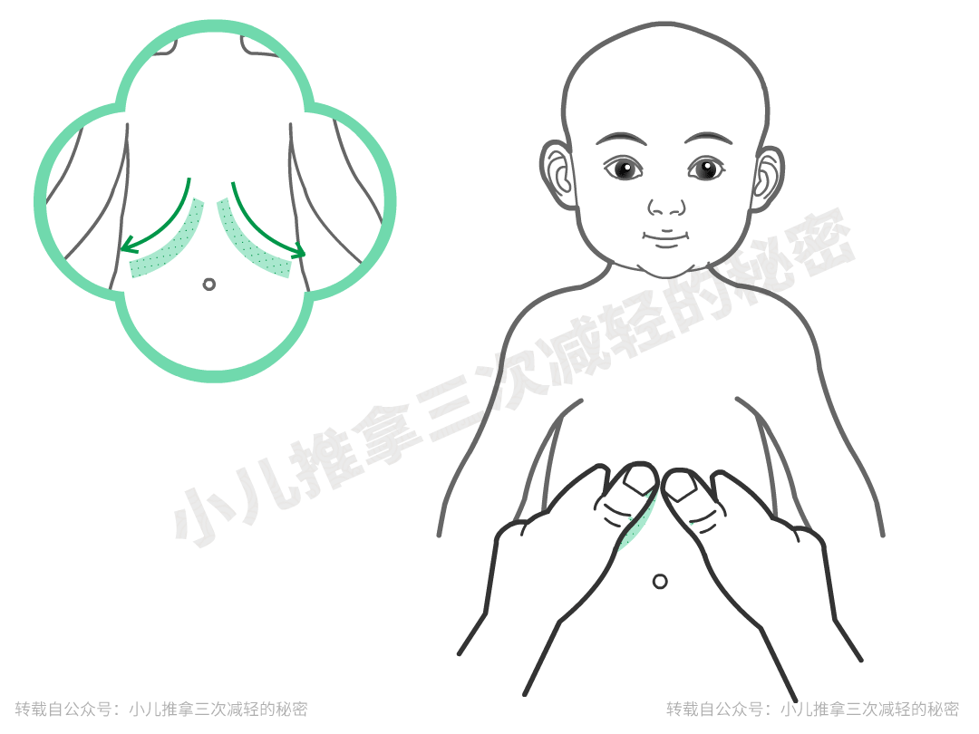 与摩腹搭配,治小儿腹泻、便秘、恶心、呕吐、腹胀等消化功能紊乱,效果较好。(一般配捏脊、揉足三里作为小儿保健之用)。