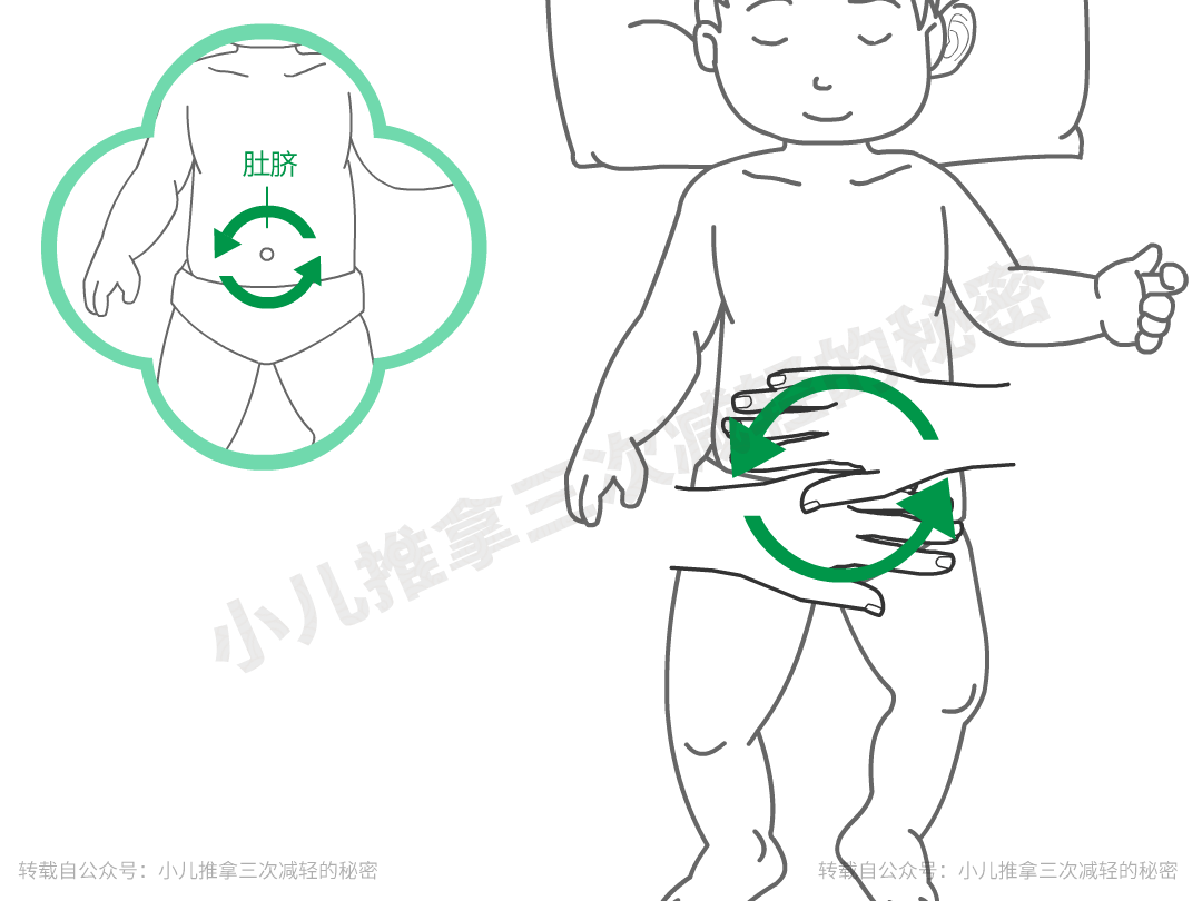 一手放在被操作者肚脐眼上,一手放到小腹上,两手上下紧挨,用手掌同时带动腹部皮下组织逆时针转动